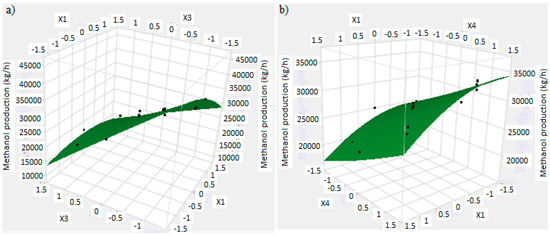 The mathematical model allows to find a response surface plot related to methanol production. Regarding to this, Figure 9a,b shows the trend of response surface for the methanol production versus significant main factors. Figure 9a shows the methanol production versus X1 and X3, respectively factors A and C: a higher production of methanol is obtained with factor A and C at lower level, as found in previous analysis. Figure 9b shows the methanol production versus X1 and X4, respectively factors A and D: a higher methanol production is obtained with factor A at lower level and factor D at higher level. However, these considerations are not related to the reactor volume, which must be minimized.