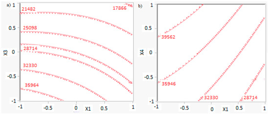 Y = 26285 2850 × X 1 7839 × X 3 + 1668 × X 1 × X 3 + 3346 × X 4 698 × X 3 × X 4   ( R 2 = 0.99 )