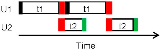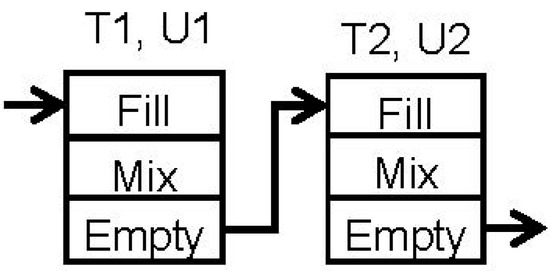 However, in a real process the transfers are rarely instantaneous. The actual recipe of the two operations may be closer to the recipe network shown in Figure 3. As shown, each task may consist of 3 subtasks, Fill, Mix and Empty. Suppose that processing times t1 and t2 defined earlier are the durations of the Mix subtasks of the two tasks. The transfer of material into task T1 takes place during its Fill subtask, and the transfer from task T1 into T2 takes place during their Empty and Fill subtasks, respectively. As a result, both units, U1 and U2, must be active simultaneously during the transfer step. Suppose the recipe network in Figure 3 is used to drive a simulation model. As shown in the Gantt chart generated by the simulator, shown in Figure 4, the first batch on U2 starts at time f1 + t1, where f1 is the duration of the Fill subtask of task T1 (shown as solid black rectangle). Similarly, the start time of the second batch of T1 will be at (f1 + t1 + e1), where e1 is the duration of the Empty subtask of T1. The duration of the Fill subtask of T2 is the same as that of the Empty subtask of T1, namely e1. The duration of the Empty subtask of T2 is e2, shown as green rectangle. Therefore, the start times of the batches on U2 as predicted by the MILP solution would not be the same as the actual process. It is immaterial how the durations of the material transfers are accounted for, whether they are included in the task times t1 and t2, or treated as additions to t1 and t2. This simple example illustrates that regardless of how the task durations are interpreted, the ‘schedule’ on the actual process will not match the solution generated by the scheduler when transfer times are not ignored. As the transfer times become more significant, the reliability of the scheduler reduces further.