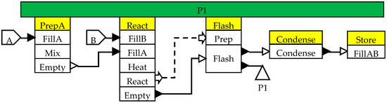 A task in a recipe may consist of several subtasks which are executed in the specified sequence once that task starts in the assigned piece of equipment. For example, task React (yellow in color) in Figure 5 consists of 5 subtasks (white boxes) FillB, FillA, Heat, React and Empty. The flow of material between tasks takes place during specific subtasks. Thus, material from task PrepA is transferred into task React only when the pieces of equipment assigned to them are in Empty and FillA subtasks respectively. Some subtasks form a semi-continuous chain, for example, subtask Flash in Figure 5. The Flash subtask takes material from the Empty subtask of the React task, splits it into two streams, sending one stream to the Condense subtask, which in turn sends it to the FillAB subtask, while the second stream is removed as product P1. Thus, in order to execute the Flash subtask, units assigned to tasks React, Flash, Condense and Store must be in the appropriate subtasks. In MILP based formulations, subtask level details are rarely considered at their fullest level, and semi-continuous transfers across multiple tasks are often treated as single tasks.