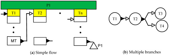 Once a batch of T1 is initiated, say through a processing directive, task T2 is started when a unit in task T1 reaches the MT subtask. Thus, T2 is ‘scheduled’ by T1. The same applies to all other tasks in a front-end driven recipe. A different pattern, shown in Figure 7b, follows the same principle that an upstream subtask triggers a downstream task but has multiple branches that are triggered. Same or different subtasks of T2 may trigger T3 and T4. Of course, these patterns could be arbitrarily complex at the subtask level.