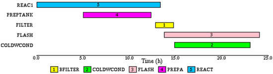 A simulation run was made based on the new STEAM consumption profile and delay of 16.7 h between reactor batches. The Gantt chart for this case is shown in Figure 16.