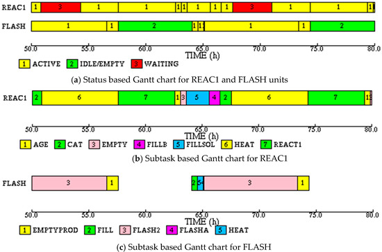 The simulation shows that the time required to make 12 batches is 233.7 h, much higher than expected. The reason for the increased makespan is the constraint on the STEAM utility. When HEAT, FLASHA and FLASH2 subtasks are running in FLASH, all of the available STEAM utility is consumed. Therefore, even if the reactor batches are started without any delay, the HEAT subtask of REACT task has to wait for STEAM to become available. In the status based Gantt chart for REAC1, shown in Figure 14a, the waiting times are shown in red. The subtask based Gantt chart in Figure 14b shows that the waiting occurs during the HEAT subtask. The waiting time on REAC1 can be eliminated by forcing idle time between successive batches on the reactor so that the end of FLASH2 is synchronized with the beginning of subtask HEAT in the reactor. This delay is approximately 19.06 h. Thus, the effective cycle time of the process is 19.06 h, thereby reducing the number of batches that can be made in the specified time.