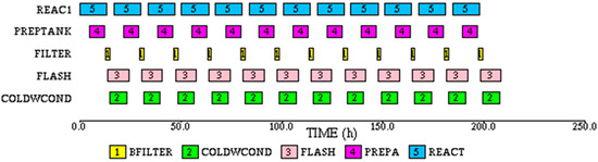 Another simulation run was made with 19.06 h elapsed time between the starts of successive reactor batches. This eliminates the waiting times on the reactor. The makespan is still 233.7 h. The task based Gantt chart for this run is shown in Figure 15.