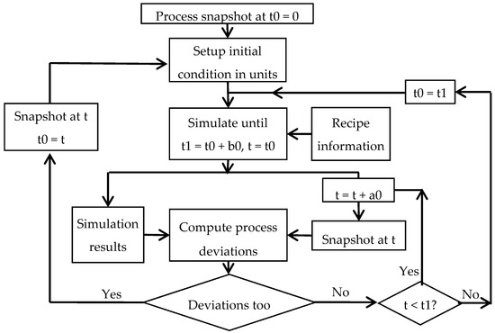 A process snapshot, which can be saved as a text file, is used to set up the initial state of all units in the model and the simulation is halted at a pre-determined end time (time increment b0), for example, 24 h after the start time. The results from the simulation run are made available in the desired format for tracking purposes. As the process marches in time, the status at any time t can be extracted and compared with that projected by the simulation. If the deviation is greater than the specified criteria, then the initial status of the model is set to the process snapshot at that time, and a new simulation run is made. The results of the new simulation are then used for tracking the process from that time forward.