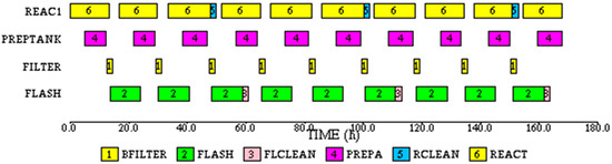 The HEAT subtasks of the REACT and FLASH tasks require more time for each batch because of fouling. The increases are 0.2 h and 0.1 h, respectively. After cleaning the associated units for 2.0 h after every third batch, the durations for these subtasks are equal to the nominal durations in Table 1. Also, the duration of the REACT1 subtask has variability, and is uniformly distributed between 4 and 6 h.
