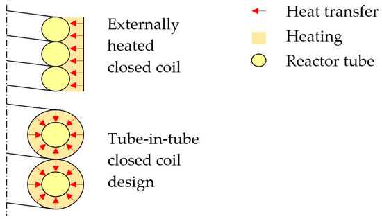 The required heat rate is given by Sceats et al. [17] in Equation (2). To account for the surrounding outer tube, the pitch was increased from 0.3 m to 0.5 m, and the coil diameter was increased from 0.76 m to 0.96 m. With these changes, the number of revolutions reduces while remaining the same length of the reactor tube.