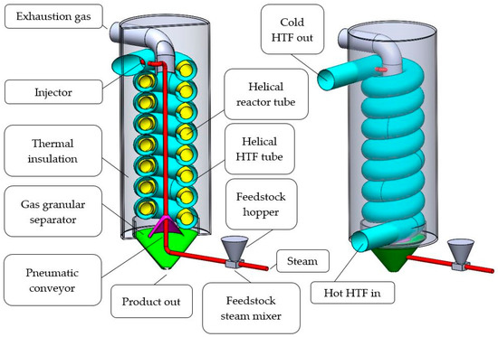 The tube-in-tube helical system for mineral calcination is schematically shown in Figure 2. In the system, the mineral feed is finely ground, mixed with superheated steam and inserted with an injector (red) at the top of the helical reactor tube (yellow). On its way, through the inside of the helix, the mineral feed is preheated by rising exhaustion gases. The calcination reaction takes place while the powder-steam-mix travels downwards through the tubular reactor. At the bottom, CO2 and calcined granules separate. Pure CO2 leaves the reactor at the top where it can be captured. The product leaves the reactor at the bottom. The calcinated product could be sent to another, similar, calcination unit if further heat treatment is required. One calcination unit has a mineral throughput of approximately 1.45 kg/s and operates at reactor tube wall temperatures ranging from 200 to 960 °C. The design takes advantage of the catalytic effect superheated steam has on the calcination reaction. MacIntire and Stansel [29] conducted experiments to reduce temperatures during limestone calcination and reactive fertilizer production of dolomite. It was shown that the required calcination temperature for limestone and dolomite could be significantly reduced in the presence of superheated steam. Donat et al. [30], Li et al. [31] and Liu et al. [32] analyzed the catalytic effect of steam on CaO, which is relevant for cyclic CO2 capture. Zarghami et al. [33] describe the catalytic effect of steam on dolomite decomposition for CO2 capture. Sceats et al. [17] conducted tests with batches of 0.2–2.0 kg finely ground (125 microns) magnesite ore (97% MgCO3). It was confirmed that the residence time, as well as the required calcination temperature, can be significantly reduced (to a few seconds and <500 °C) if the material is finely ground and superheated steam (also <500 °C) is present.