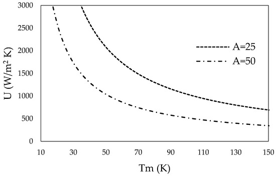 Using the rate equation (Equation (5)), the total heat transfer coefficient can be expressed over the mean temperature difference of the bulk mineral-steam mix in the inner tube and the HTF in the outer tube. Figure 3 shows the mean temperature difference over the total heat transfer coefficient that needs to be met to reach the power required for one segment (A = 25 m2) and two segments (A = 50 m2).