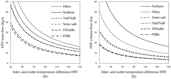 The rate equation (Equation (5)) can further be expressed using the mass flow and heat capacity of solar salt and other HTFs (Equation (6)). Figure 4 shows the required HTF mass flow (left) and the required HTF volume flow (right) over the HTFs inlet- and outlet temperature difference for various HTFs. The density and heat capacity of the HTFs are dependent on temperature. The arithmetic mean temperature and thermal characteristics of the HTFs, as suggested by Serrano-López et al. [64] and Boerema et al. [65], were taken for these calculations.