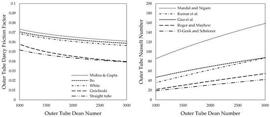 The outer tube friction factor has been calculated for solar salt using the expressions, as provided in Table 2. Results are shown in Figure 5 (left) over the respective outer tube Dean numbers. The obtained results were compared to results for a straight tube and an angular duct using Konakov’s [54] equation as suggested by Gnielinski [51,53].