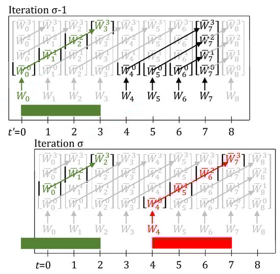 Task-states are shown for two online iterations – numbered and . Each iteration uses its own local time-grid which is reset to start from 0. Here, for the tasks is assumed to be 3. Lifting of past inputs enables knowing the complete status of the plant by looking at the states (variables) only at that moment in time. In the absence of delays or breakdowns, the lifting equations effectively represent the relation: . Arrows show which variables are equal due to the lifting equations (Equations (11) and (12), with no delays or breakdowns). Variables in green or red have a value of 1, rest have value 0. Information is carried over from one iteration to the next through the update step (Equations (17)–(19)).