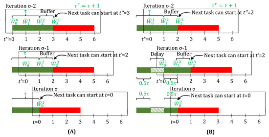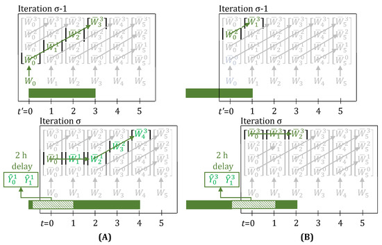 When a 2 h delay is observed, through the lifting equations, evolve over the green trajectory, leading to the task correctly finishing 2 h late in iteration . Here, for the task is 3. Arrows show which variables are enforced as equal by the lifting equations (Equations (22)–(24), with delays present). Variables and parameters in green have a value of 1, rest have value 0. (A) The task now finishes at , instead of at . Due to the update step, parameters , and variable are 1, hence, in iteration , due to the optimization model, , , and are also 1. (B) The task now finishes at , instead of at . The update step ensures that the true progress, n, of the task is reflected in the task-states at , i.e., .
