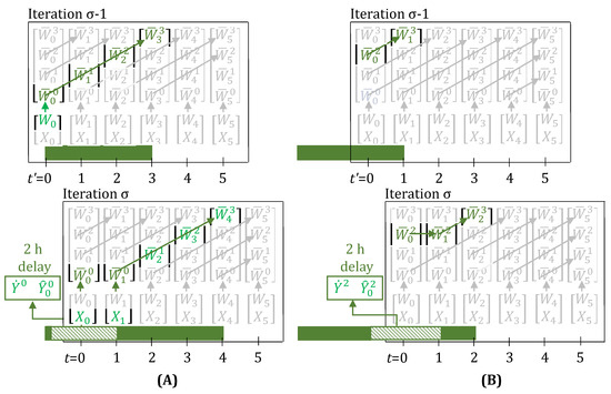 When a 2 h delay is observed, through the lifting equations, evolve over the green trajectory, leading to the task correctly finishing 2 h late in iteration . Here, for the task is 3. Arrows show which variables are enforced as equal by the lifting equations (Equations (11) and (12), with delays present). Variables and parameters in green have a value of 1, rest have value 0. (A) The task now finishes at , instead of at . (B) The task now finishes at , instead of at . Through Equation (13), the unit is kept busy at and 1, by the inclusion of the terms and , and hence a new task is prevented from starting at these times. In addition, these terms in Equation (14), prevent the task’s produce from erroneously contributing to inventory ( and ).