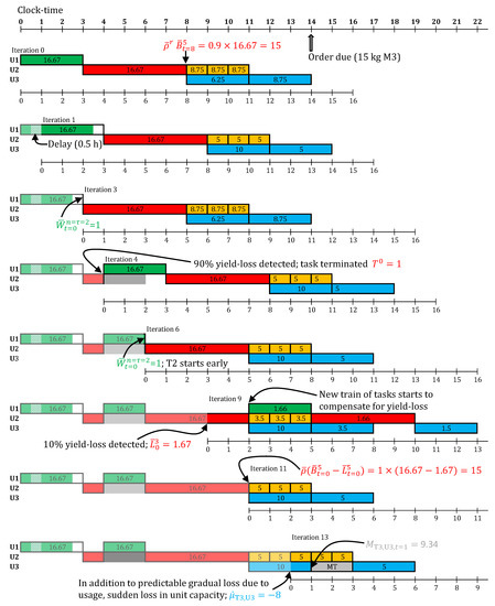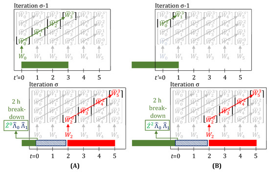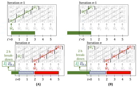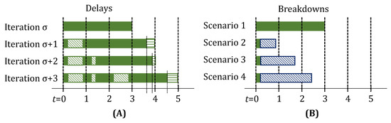 Figure 3A,B, show the evolution of task-states when a 2 h delay is observed right after a task starts and just before a task is about to finish, respectively. The 2 h duration of this multi-period delay is known immediately in iteration . However, the model formulation also does allow for representing the observation of consecutive, possibly independent, 1 h single-period delays, one at a time in succeeding iterations. These collectively, in hindsight, appear to be a single multi-period delay, but are actually not.