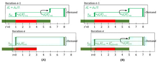 When a breakdown is observed, further evolution of the task-states for the task (the green trajectory), running on the unit that broke, stops. Here, for the task is 3 and the unit downtime (blue) is 2 h. Arrows show which variables are enforced as equal by the lifting equations (Equations (22)–(24)). Variables and parameters in green, blue, or red have a value of 1, rest have value 0. The green task is suspended at . A new task (red) can only start at , once the unit downtime is over. Through Equation (25), the unit is kept busy at and 1, by the inclusion of the terms and . (A) The parameter , through Equation (20), prevents the task-state from evolving from to . (B) The parameter , through Equation (20), prevents the task-state from evolving from to .