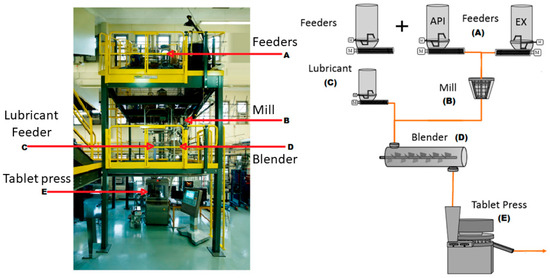 The continuous direct compaction tablet manufacturing pilot-plant that has been used for this study is shown in Figure 1. The pilot-plant is situated at ERC-SOPS, Rutgers University, USA [33]. The pilot-plant is built in three levels in such a way that gravity can be used as the driving force for material transport. The top most level is assigned to feeding and powder storage, the middle layer is designated to the task of blending and de-lumping and the bottom layer is used for compaction. Each of these levels spans an area of at least 10 × 10 square feet. The current equipment set includes three gravimetric feeders with the capability of expansion. Following the feeders, a co-mill is integrated for de-lumping the powders as mentioned before and creating contact between the components. The lubricant feeder is added after the co-mill to prevent over lubrication of the formulation in the co-mill. All these streams are then connected to a continuous blender to create a homogenous mixture of all the ingredients. The exit stream from the blender is fed to the tablet press via a rotary feed frame. The powder blend fills a die, which is subsequently compressed to create a tablet.