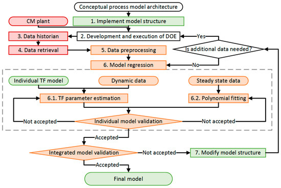 A systematic framework, shown in Figure 2, has been developed to guide future pharmaceutical modelling efforts. The framework starts with a conceptual model that is developed based on previous process knowledge. In this step, critical process parameters, critical quality attributes and any other relevant intermediate variables are identified. A simplified sensitivity analysis can help determine which variables should be integrated in the model. Once the model has been conceptualized, its architecture is implemented in Simulink (Mathworks). The model structure is defined according to the interaction between different variables and whether dynamic data can be obtained for all the variables. This structure can be derived empirically or based on first principles, being based on transfer functions, state-space and non-dynamic models.