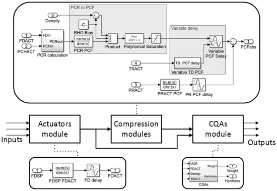 Model implementation overview. FDACT: Fill depth; PCR: Pre-compression ratio; PCF: Pre-compression force; RHO: Density; PRACT and PR: Production rate; TD: Transport delay; FDSP: Fill depth set point; CQA: Critical quality attribute.