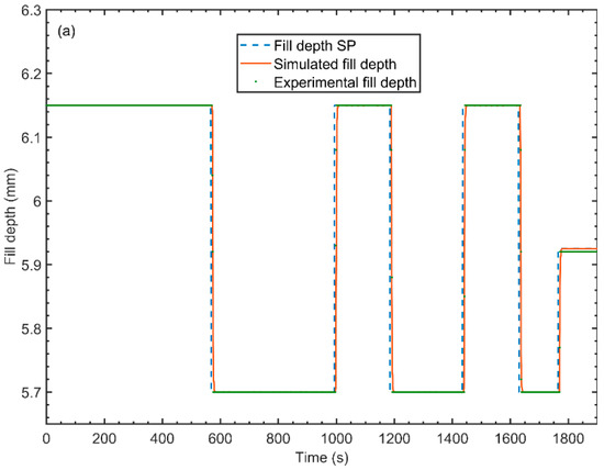 In Figure 5a, the simulated, experimental and set point values are plotted for fill depth. This model is driven by a transfer function and the regressed parameters for the same are provided in Table 1. This model is characterized by a response that is of first order dynamics. The figure shows step changes going from 6.15 mm to 5.7 mm in a step down and from 5.7 to 6.15 mm in a step up. These step changes are made in arbitrary time intervals to make sure of the model robustness. The close correlation between the simulated and experimental fill depth along with an R2 value of 0.9966 indicates that the model is very accurate.