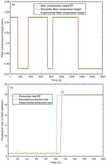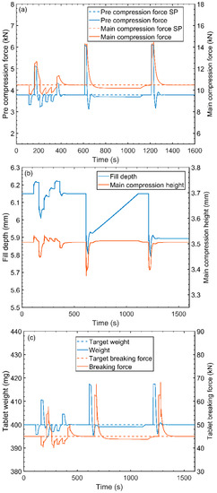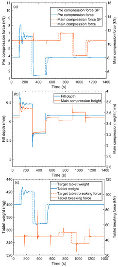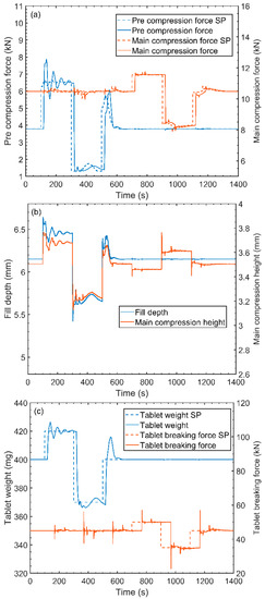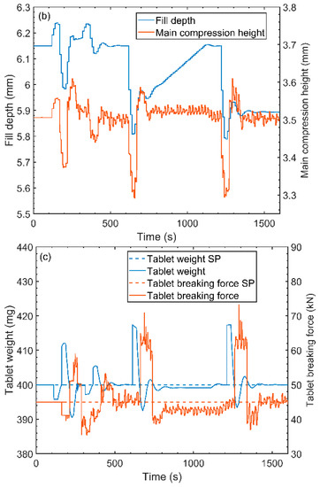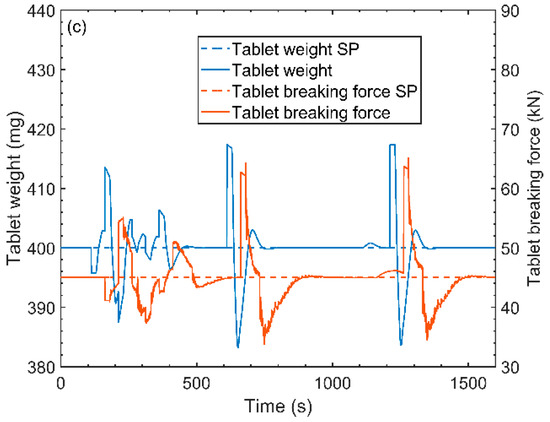 The effect that changes in the compression forces set points have on tablet weight and breaking force is shown in Figure 11c. Understanding the interaction between compression forces and tablet CQAs is necessary in order to achieve indirect control over them. No cross interaction between tablet weight and main compression force as well as tablet breaking force and pre-compression force is seen on the image, which indicates that tablet CQAs can be indirectly and independently controlled through the compression forces’ set points. These set points can be determined manually by the operator or remotely by a supervisory controller, depending on the real-time data availability for tablet CQAs.