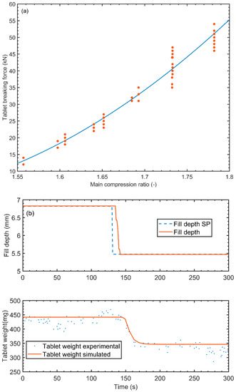 The main compression force and pre-compression force are the two main controlled variables as they directly affect the tablet breaking force and can be made to influence tablet weight. Previous literature provides information on the nonlinear correlation between tablet tensile strength and compaction force [36]. The Kawakita equation provides a correlation between the compaction pressure and volume [37]. In this work, a nonlinear correlation between compaction force and the ratio of the fill depth and the compaction height has been derived and presented. From the control perspective, this information is valuable as it gives direct information about the actuators and the controlled variables.