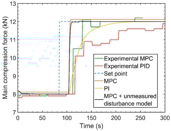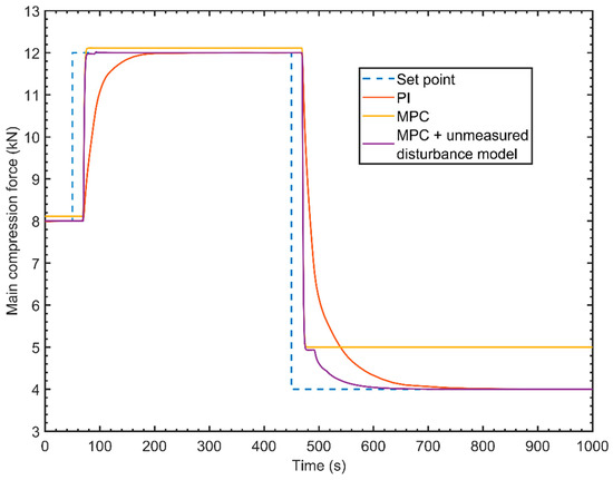 Two main compression force set point changes were applied to the system and its dynamic response was observed. The first step change was within the range at which the controllers were tuned and increased the MCF set point from 8 kN to 12 kN. The latter step change varied the MCF set point from 12 kN to 4 kN and was outside the range at which the controllers were tuned. The magnitude and range of the step changes were chosen in order to observe how linear controllers behave in different regions of a non-linear process.