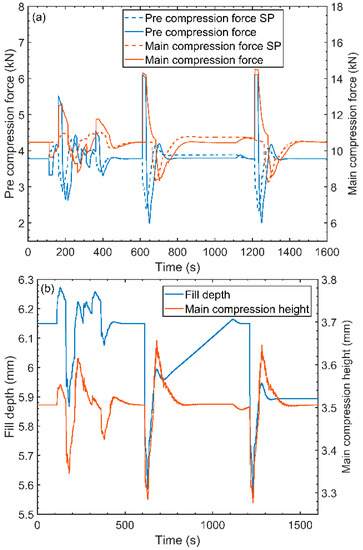 Figure 11a shows the dynamic response of the simulated system when set point changes are applied to both compression forces. The actuation signals are shown in Figure 11b. The implemented controller enables both variables to successfully track their respective set points. As expected, changes in main compression force set point have no effect on pre-compression force, since the main compression height (MCF actuator) does not interact with the pre-compression force. In an open loop scenario, manipulations in fill depth (PCF actuator) would lead to large variations in both forces. However, when the controller is on, changes in pre-compression force set point, which cause an actuation on fill depth, generate only a small deviation in main compression force. This occurs because the controller takes preventive actions on main compression height to mitigate the effect that fill depth changes have on main compression force. This indicates that the controller internal model is able to capture the interactions between manipulated and controller variables.