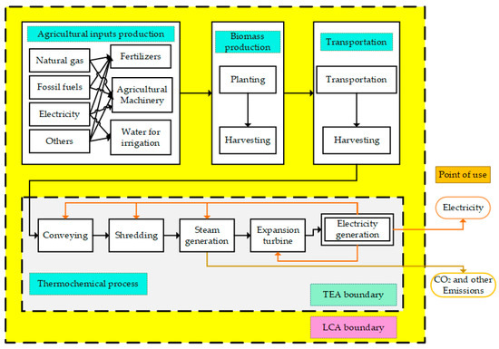 System boundary showing the techno-economic (TEA) and life-cycle assessment (LCA) boundary for the lignocellulosic power production. Grey color represents the TEA boundary, while the yellow color represents the LCA boundary.