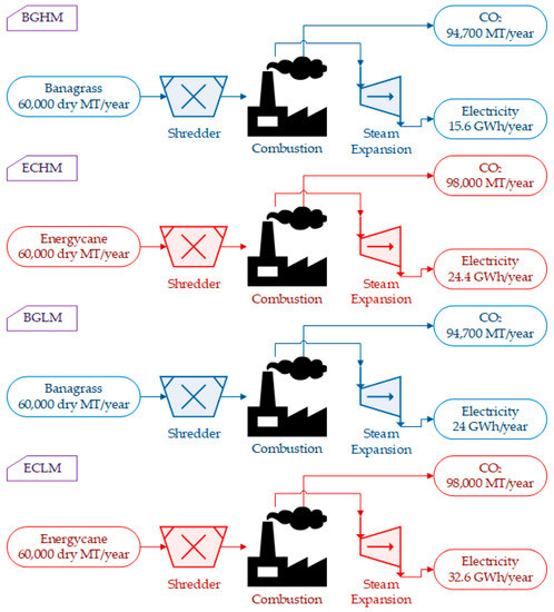 In this study, four scenarios were considered that used two biomasses (banagrass and energycane). For banagrass “BG” was used as the acronym, while for energycane it was “EC”. When the biomass had high moisture content, the acronym “HM” was used. For field-dried biomass that had low moisture content, “LM” was used. For example, BGLM refers to the scenario that used banagrass with low moisture. The loss of moisture by field drying the biomass was assumed as 25% (Table 1).