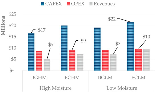 Table 3 shows the cost of different equipment used in the four scenarios with their processing throughputs. The shredder load decreased with the decrease in moisture content of the field-dried biomass. The cost of the turbines ranged between $590,000 and $1,092,000 for capacities of 2591 kW and 5922 kW. The boiler had a throughput of between 30,000 kg/h and 54,000 kg/h that cost $372,000 (BGHM) and $583,000 (ECLM). The total cost of the equipment for different scenarios ranged between $2.3 and $3.0 million. The equipment costs represents a part of the total capital investment, while the other costs include installation, piping, instrumentation, insulation, electrical, building, auxiliary facilities, indirect costs, contractor fees, and contingencies. Figure 4 shows the different economic indices including capital expenditure (CAPEX), operating expenditure (OPEX) and revenues generated from different scenarios. The capital investment ranged between $17 million and $22 million for different scenarios. In general, low-moisture content scenarios by field drying the biomass increased the CAPEX. This was due to the use of a higher capacity boiler and turbines.