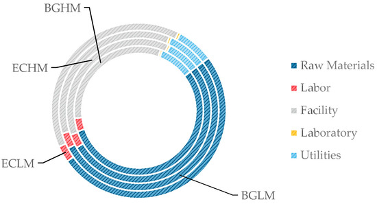 The OPEX varied between $8.7 million and $9.5 million for all the scenarios. Recovering the OPEX through revenues was only possible from the ECLM scenario (Figure 4). For all scenarios, the cost of the feedstock at $80/dry MT accounted for ca. 50% of the OPEX (Figure 5). Raw material was the most significant contributor to OPEX followed by facility-dependent costs that ranged between 32% and 39%. This shows that the cost of producing biomass needs to be controlled for any biomass-based energy/chemicals; failing to do so questions the economic viability of the project. Utilities consumption corresponds to 7–9%, while the wages for the labour was 3% of OPEX.