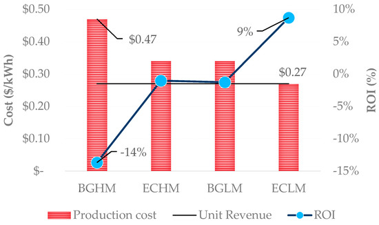 The minimum electricity-selling price refers to the minimum costs at which the electricity needs to be sold for a zero NPV. MESP also refers to the levelized cost of electricity (LCOE) that means the cost that is incurred over the processing plant’s life to produce the total amount of energy during the same period. Figure 9 shows the MESP along with the production cost and unit revenue generated for each of the four scenarios. Under the scenarios including BGLM, ECHM, electricity needs to be sold at $0.42/kWh to meet a zero NPV while for BGHM, it should be $0.60/kWh. The most profitable scenario, ECLM, needs to sell at 6 cents higher than the current unit revenue generated to have a zero NPV i.e., $0.27/kWh. ECLM could recover the investments after 11 years (payback period). The LCOE of using different technologies including photovoltaics, wind, geothermal and nuclear that provide electricity in the Hawaiian Islands ranged between $0.1–0.5/kWh [22]. The ECLM (this study) would be on a median in comparison with the data reported; showing that further reduction in biomass costs could favor the commercialization of biomass-based power production.