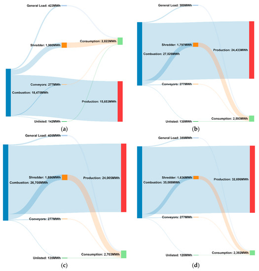 Figure 7 shows the energy analysis via a Sankey diagram based on the breakdown of consumption and production patterns. For scenario BGHM, about 15% of the produced electricity was consumed in different forms including a shredder, conveyors, general load and unlisted equipment. Similarly, for other scenarios, i.e., BGLM, ECHM and ECLM the consumption was 9.5%, 10.1% and 6.8%, respectively. The shredder dominated ca. 70% of the electricity consumed. The net electricity production for different scenarios was 15,653 (BGHM), 24,433 (BGLM), 24,005 (ECHM) and 32,696 (ECLM) MWh/year. It is worth mentioning that LM scenarios had higher electricity consumption for shredder (0.15 kW/(kg/h)) than HM scenarios (0.09 kW/(kg/h). However, the LM scenarios produced more electricity in comparison with HM scenarios.