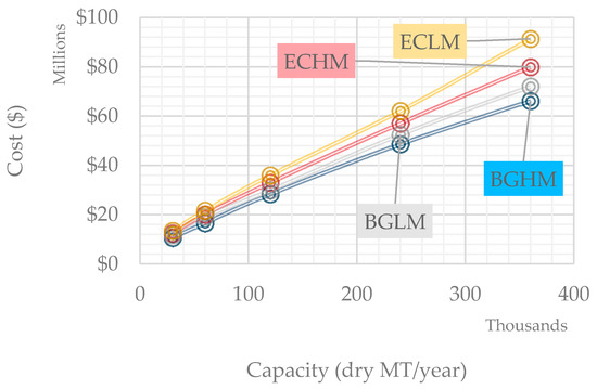 The base scenarios considered an annual processing capacity of 60,000 dry MT/year, which is relatively small considering the plant sizes in the mainland US. For this reason, an uncertainty analysis was carried out identifying the CAPEX of the process under different capacities. The capacities considered were between 30,000 dry MT/year and 360,000 dry MT/year. Figure 8 shows the uncertainty analysis on the CAPEX for different scenarios evaluated in the base case. As a rule of thumb by economies of scale, when the capacity increases the CAPEX goes down. To process 1-MT of biomass (BGLM) with a plant capacity of 30,000 dry MT/year, it costs $390/MT; while the same scenario operating at 360,000 dry MT/year costs $200/MT following the economies of scale principle. Increasing the capacity of the processing plant by 12 times from 30,000 dry MT/year, decreased the CAPEX by 95% on a functional unit level i.e., $/MT. It is worth mentioning that the base scenario had a processing capacity of 60,000 dry MT/year that costs $320/MT (BGLM).