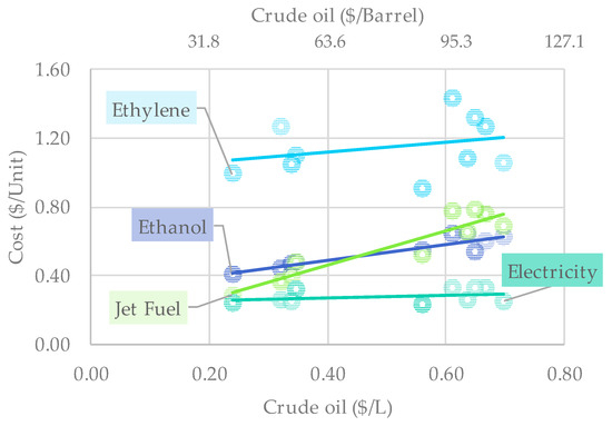 A historical comparison of the unit cost of electricity, jet fuel, ethanol and ethylene in relation to crude oil from 2007 to 2016. The primary horizontal axis shows crude oil as $/L, while the secondary horizontal axis shows the crude oil as $/Barrel to ease understanding.