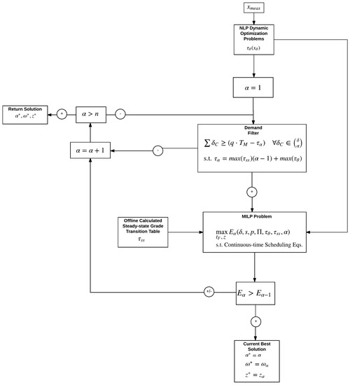 A heuristic demand filter is introduced to further reduce computational burden (Figure 1). The filter checks for any combination of products with summed demand sufficient to fill the prediction horizon for scheduling and control. This effectively filters each possible for sufficient demand before the MILP problem is executed. In calculating the minimum summed demand which must be met for the given iteration for the MILP problem to be executed, the filter accounts for transition times calculated by NLP dynamic optimization problems both offline (all stored in ) and online (all stored in ). The demand must be sufficient to fill the production potential of the prediction horizon, which equates to (), where is the summed grade transition durations. To ensure each which has potential for sufficient demand is tested in the MILP problem, the demand filter overestimates for transition times. In the case of underestimation of total transition times (), the demand required to fill production during the prediction horizon () will be overestimated. In a such case, a combination which would have had enough demand may inaccurately be deemed insufficient. Since often the optimal number of slots will be the smallest number of slots with sufficient demand (because the number of grade transitions and the corresponding amount of off-specification production increases with the number of slots), it is pertinent to not underestimate the durations of grade transitions. To eliminate such underestimation, the maximum transitions are used for estimations of the total transition time during the prediction horizon ().