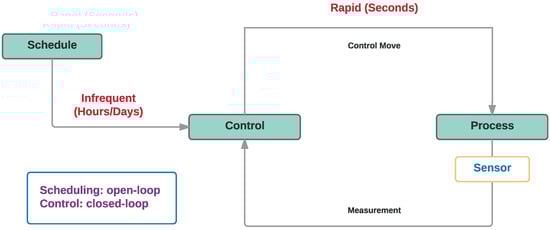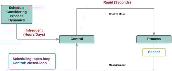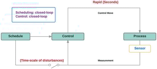 A schedule is created infrequently (every 24 h in this work) and a controller seeks to implement the schedule throughout the 24 h with no other considerations. In this format, the schedule is open-loop, whereas the control is closed-loop. The controller acts to reject disturbances and process noise to direct the process to follow the predetermined schedule (see Figure 1).