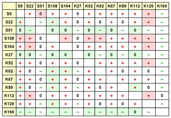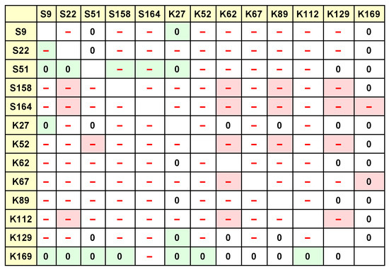 Tukey test results for the lag time . Each row collects the results of Tukey tests with a particular focal strain, the columns then indicate the strains that were tested for interaction effects with it. The entry in cell indicates the difference (if any) between the community containing species i and species j, and the control community: “+” indicates the parameter values were significantly larger than the values, “–” indicates they were significantly smaller, and “0” indicates no significant difference. The background colour of cell indicates the difference (if any) between the community containing species i and species j, and the community containing species j: green indicates the parameter values were significantly smaller than the values, red indicates they were significantly larger, and no colour indicates no significant difference.