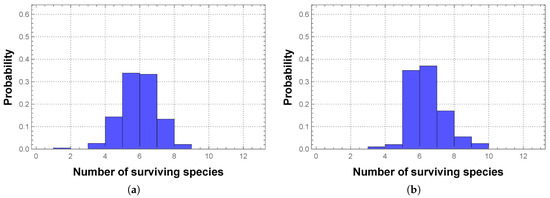 Probability of observing a particular species richness after 1000 generations for (a) deterministic and (b) non-deterministic competition based on effects. Probabilities calculated from 200 replicates.