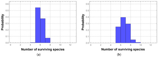 An additional extension of our modelling approach that will bring it closer to reality is to also consider non-deterministic competition. Deterministic competition assumes that, if the competition structure specifies that A beats B, this will always occur: it will never be possible for B to beat A. This is reflected in the competition matrices and , which contain only 1’s (implying certain victory), −1’s (certain defeat) and 0’s (no competition). But this is not always realistic [30,31,32]. Variation between individuals can result in an individual of species A that is a particularly weak competitor, and an individual of species B that is a particularly strong competitor. If these two specific individuals meet, the outcome of the competition can be in doubt. It may be more realistic to specify a so-called winning probability [33,34]: the probability that A beats B. Including a winning probability allows for different competition outcomes to occur, and the value of the winning probability allows us to account for the relative strengths of the individuals.