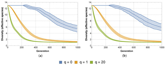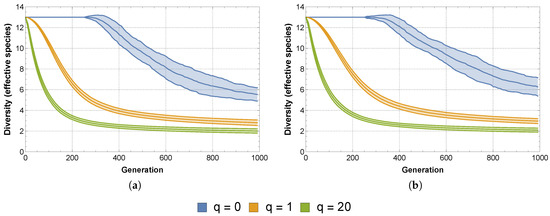 Mean diversity profiles (Leinster-Cobbold index) for , for (a) deterministic and (b) non-deterministic emergent competition based on effects. Mean and standard deviation calculated from 200 replicates.