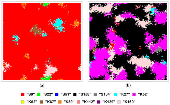 These diversity effects, and the spatial dynamics underlying them, can also be observed in Figure 7, where we show two representative examples of the grid configuration at generations for non-deterministic competition based on lag time (Figure 7a) or mineralization rate (Figure 7b) interaction effects. As was observed in Figure 5 and Figure 6, competition based on the former results in more uneven communities than competition based on the latter. In the former case, sufficient species are present in sufficient numbers to form the spiral patterns characteristic of this type of individual-based models, which have been shown to help maintain coexistence [40]. These patterns also qualitatively resemble those observed in in vitro experiments where a similar synthetic community of SFIs was co-cultured with MSH1 in the presence of BAM [18]. The spiral formations also enable spatial refuges, which have been observed to support species coexistence by allowing vulnerable species to persist at low but still significant levels [44]. Such refuges can be observed for example in Figure 7b for multiple species.