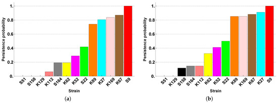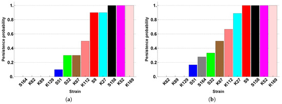 Having studied community diversity effects, we can now turn our attention to the composition of these persisting subcommunities. In Figure 8, we show the persistence probability for each SFI for deterministic and non-deterministic competition based on lag time interaction effects. The results reflect the dynamics illustrated in Figure 7a: S9 is the dominant strain, but it is a member of a subgroup of SFIs that are present in the majority of the simulations. This is unsurprising, since S9 was the strongest competitor in the two competition structures based on interaction effects ( and ) and thus it is the dominant SFI in the persisting subcommunity, which we recall is quite uneven (see e.g., Figure 5 and Figure 7). In more than of the simulations, we observe the same SFIs persisting together: S9, K67, K169, K27 and K89. This is true for both the deterministic and non-deterministic competition cases.