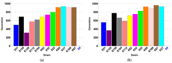 Finally, we examine extinctions in our different communities. We have seen that extinctions are frequent, but generally limited to the same set of SFIs. In Figure 10, we show the average time to extinction for each SFI, for deterministic and non-deterministic competition based on lag time interaction effects. We note again that these are slightly longer for non-deterministic competition compared to deterministic competition, and always occur after an initial period of spiral formation (~300 generations). One strain, K129, collapses to extinction not long after spiral formation has commenced; this strain is the weakest in both competition structures. After it disappears, there is another lapse before extinctions recommence and thereafter proceed fairly regularly until the community is reduced to the persisting uneven subcommunity dominated by S9 (which never suffers any extinctions) and the other strains in small proportions.