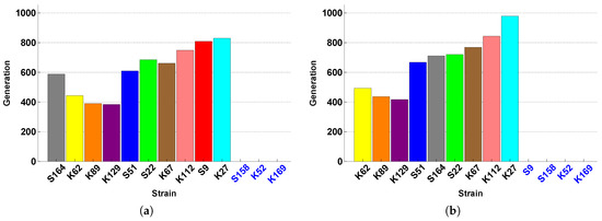 Mean time to extinction per strain for (a) deterministic and (b) non-deterministic emergent competition based on effects. Blue labels indicate strains for which no extinctions occurred. Means calculated from 200 replicates.