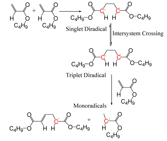 The triplet diradical also includes two monomer units. A triplet diradical has two “spin-up” electrons in adjacent, degenerate (equal energy) orbitals (two electrons of the same spin, +1/2 and +1/2) [38]. Finally, a third monomer molecule abstracts a hydrogen atom from the triplet diradical and forms two monoradicals, one with two monomer units (MM*) and the other with one monomer unit (M*):