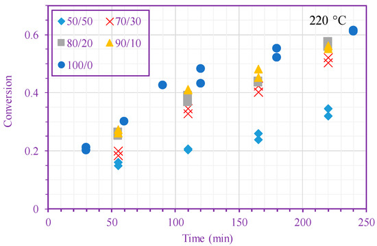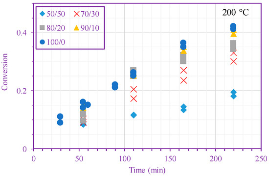 Measured n-BA conversion vs. time (different n-BA/n-heptane ratios) at 200 °C (top) and 220 °C (bottom).