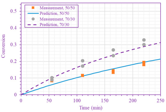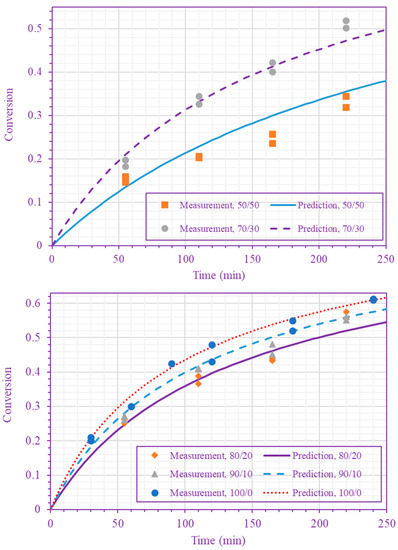 Measured and predicted n-BA conversion at 220 °C ( n-BA/n-heptane volume ratios 50/50 and 70/30 (top), and 80/20, 90/10, and 100/0 (bottom)).