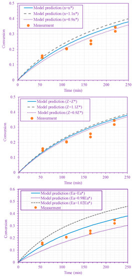 The frequency factor, activation energy, and the order of n-BA overall self-initiation reaction estimated from the conversion measurements are: , and . A possible reason for this frequency factor value (estimated here for solution polymerization) being less than the value obtained for bulk polymerization [39] is the cage effect of the solvent. Figure 3 and Figure 4 show the model prediction of n-BA conversion with these estimated values. They indicate that the model can predict the conversion well at all temperatures and solvent concentrations. The frequency factor and activation energy values reported here for the solution polymerization agree well with the values already reported for the bulk polymerization: and (J/mol) [39]. The order of the monomer self-initiation reaction found here also agrees well with the one obtained theoretically through quantum chemical calculations [35,36,37]. Figure 5 shows the sensitivity of our macroscopic mechanistic model to changes in the order, activation energy, and frequency factor. It indicates that the predicted conversion has the lowest sensitivity to the frequency factor and the highest sensitivity to the activation energy, .